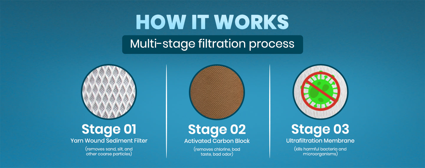 The yarn wound sediment filter captures particles larger than 5 microns, while the activated carbon block removes unwanted colour, taste, and odour, and reduces harmful heavy metals and chlorine by-products.